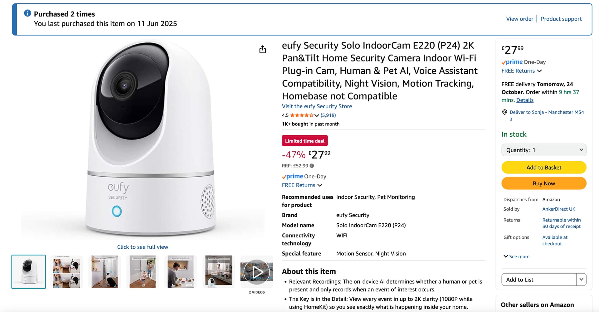 Just a quick heads-up — the Amazon listing for the Eufy Security Solo IndoorCam E220 (P24) says: